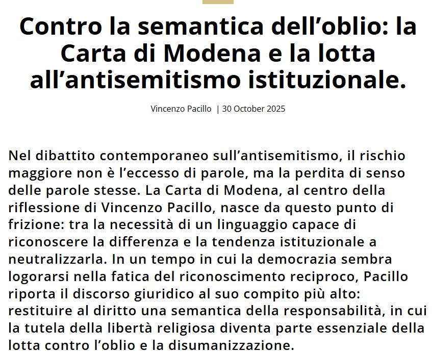 Nel dibattito contemporaneo sull’antisemitismo, il rischio maggiore non è l’eccesso di parole, ma la perdita di senso delle parole stesse. La Carta di Modena, al centro della riflessione di Vincenzo Pacillo, nasce da questo punto di frizione: tra la necessità di un linguaggio capace di riconoscere la differenza e la tendenza istituzionale a neutralizzarla. In un tempo in cui la democrazia sembra logorarsi nella fatica del riconoscimento reciproco, Pacillo riporta il discorso giuridico al suo compito più alto: restituire al diritto una semantica della responsabilità, in cui la tutela della libertà religiosa diventa parte essenziale della lotta contro l’oblio e la disumanizzazione.