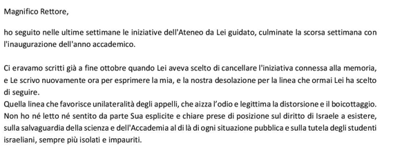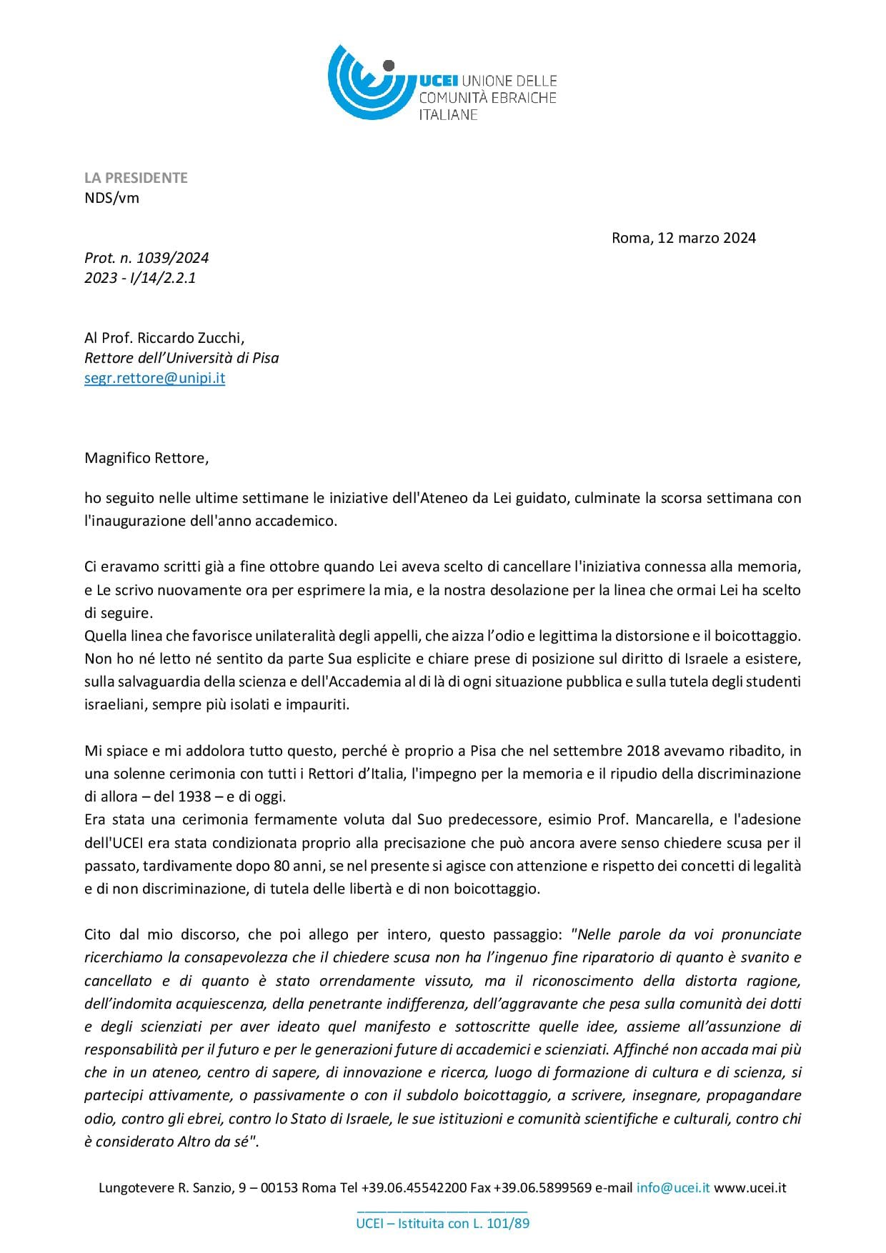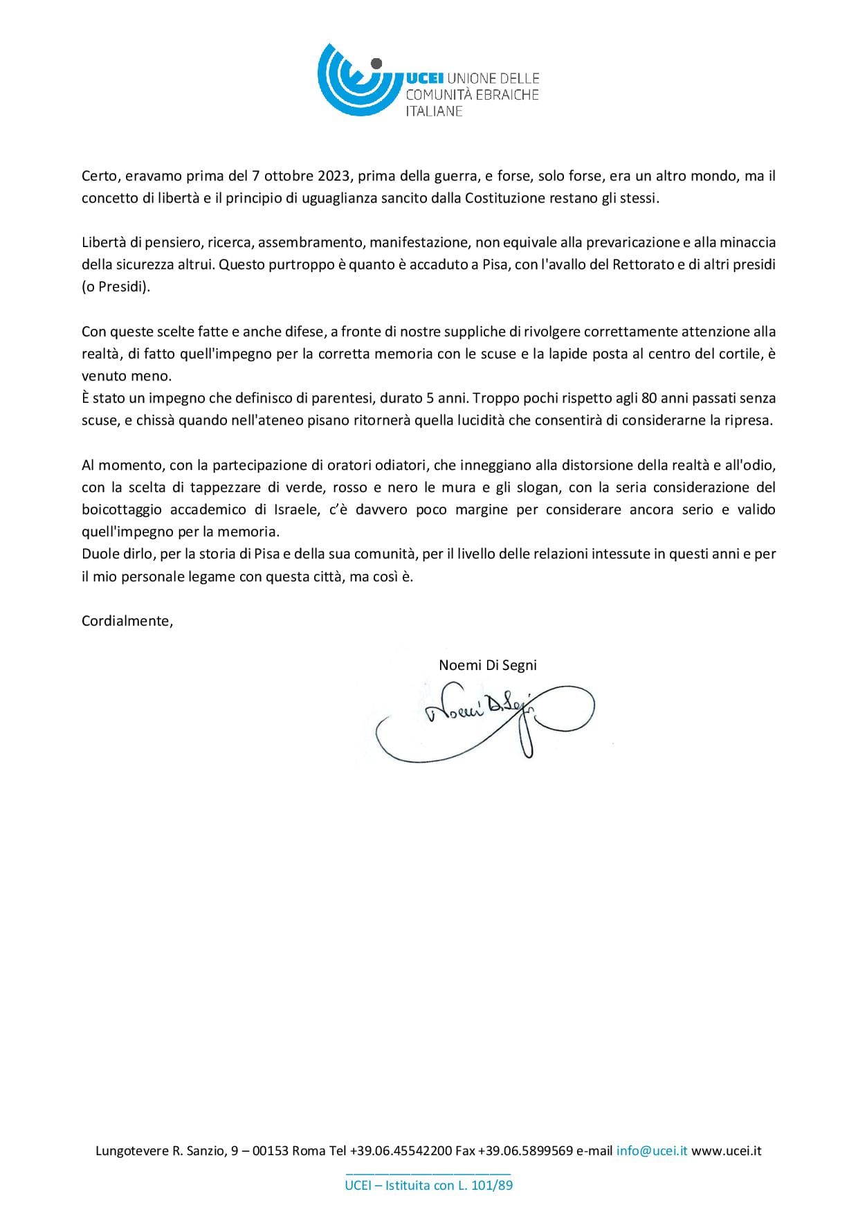 Le comunità ebraiche contro l’Università di Pisa «per la linea che favorisce unilateralità degli appelli, aizza l’odio e legittima la distorsione e il boicottaggio». A usare queste parole forti è la presidente dell’Unione delle Comunità ebraiche Noemi Di Segni in una lettera al rettore Riccardo Zucchi dopo l’intervento di Anas Khalil, studente italopalestinese e figlio dell’imam cittadino, alla cerimonia inaugurale dell’anno accademico, a inizio marzo, che aveva detto che «siamo di fronte a un genocidio in potenza» per i palestinesi. «Non ho letto né sentito sue esplicite prese di posizione sul diritto di Israele a esistere — dice Di Segni rivolgendosi al rettore —, sulla salvaguardia della scienza e dell’Accademia e sulla tutela degli studenti israeliani, sempre più isolati e impauriti». Poi aggiunge che «è venuto meno» quell’impegno portato avanti dalla cerimonia universitaria nel corso della quale, cinque anni fa, venne posta una lapide al centro del cortile de La Sapienza per ricordare la firma delle leggi razziali. Secondo Di Segni quell’impegno è stata «una parentesi durata 5 anni: troppo pochi rispetto agli 80 passati senza scuse e chissà quando nell’ateneo pisano ritornerà quella lucidità che consentirà di considerarne la ripresa». Riguardo alla cerimonia di inaugurazione dell’anno accademico, il rettore ha replicato a Di Segni dicendo che, «dopo gli eventi in cui manifestazioni studentesche sono state interrotte con l’uso della forza, abbiamo sentito il bisogno di dimostrare che l’università è un luogo aperto alla libera e pacifica espressione delle opinioni, anche su temi delicati e divisivi. Per tale ragione è stato offerto uno spazio a gruppi studenteschi che in questi mesi e su varie questioni avevano presentato mozioni che verranno discusse nella riunione straordinaria del Senato accademico in programma il 14 marzo. Il gruppo Rompere l’Assedio ha accettato l’invito e un suo rappresentante, designato dal gruppo stesso, ha effettuato l’intervento a cui fa riferimento». Riguardo invece alla tutela degli studenti israeliani per cui Di Segni ha espresso preoccupazione, «gli studenti di origine israeliana, ebraica, palestinese e di ogni altra etnia o religione sono parte a pieno titolo della comunità universitaria pisana». E poi: «Peraltro durante la cerimonia di inaugurazione ho ribadito il mio sgomento per la strage dei civili israeliani dell’ottobre scorso e per la strage dei civili palestinesi attualmente in atto a Gaza, e in passato più volte abbiamo unito la voce del nostro ateneo a tutte le voci che chiedono l’immediato cessate il fuoco e la liberazione degli ostaggi». Sul tema è intervenuto anche il console onorario di Israele Marco Carrai, che a suo dire sarebbe stato escluso dalla possibilità di parlare oggi al Senato Accademico in supporto di una mozione presentata per denotare la paura degli studenti ebrei e israeliani e di alcuni professori nel frequentare l’Università: «Il rettore — ha detto Carrai — mi ha risposto che nessun esterno può parlare al Senato Accademico dell’Università», eppure «all’indomani delle polemiche scaturite dall’intervento dello studente, aveva fatto un comunicato per dichiarare l’apertura a interventi esterni al fine di approfondire la tematica». Secca la replica del rettore: «La mozione sarà discussa alla presenza di tre persone interne all’università che l’hanno presentata, così prevede il regolamento, il console Carrai è invitato a venire a trovarmi quando vuole».