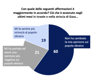 Sarebbe in calo la percentuale di italiani che riconosce l’utilità del Giorno della Memoria. Lo si apprende dall’ultima indagine dell’istituto di ricerca Swg, che dal 2014 monitora ogni mese di gennaio la percezione e i sentimenti della cittadinanza nei confronti dell’appuntamento. Una percezione condizionata quest’anno “dal conflitto in corso tra Israele e Hamas”, sottolinea Swg, evidenziando che gli eventi innescati dal 7 ottobre “se da un lato hanno portato una quota di italiani a una maggiore vicinanza emotiva verso il popolo ebraico, dall’altra parte hanno generato distacco verso le scelte del governo israeliano” e questo sembra avere generato “un effetto leggermente negativo anche nella percezione del Giorno della Memoria”. Il 23% degli intervistati ritiene che non serva “più a nulla”, mentre per il 16% sarebbe una questione “che riguarda solo gli ebrei”. Dati entrambi in crescita rispetto al 2023, quando l’orientamento del campione verso queste due opzioni era stato rispettivamente del 22% e del 15%. In diminuzione importante è invece il numero di chi ritiene che il Giorno della Memoria aiuti “a non dimenticare ciò che è successo” (dal 91% del 2023 si è passati oggi all’83%) e di chi pensa che aiuti “a mantenere viva l’attenzione su queste problematiche” (dall’86% si è scesi al 77%). In un’altra domanda Swg chiede di completare la frase “Secondo lei ricordare il genocidio degli ebrei e delle altre vittime del nazismo attraverso il Giorno della Memoria è…” con un aggettivo. Scelgono “giusto” il 37% delle persone, mentre “formativo” il 35%, “dovuto” il 28%, “retorico” l’11% e “inutile” l’8%. Per quanto riguarda il conflitto in Medio Oriente, dopo un iniziale appoggio maggioritario alla “comunità israeliana”, oggi a prevalere è la vicinanza a “quella palestinese”. Si dichiarano “più vicini” ad Israele il 14% degli intervistati, mentre il 21% è più solidale con i palestinesi. Il 26% del campione, individuato tra 800 soggetti rappresentativi della popolazione italiana maggiorenne intervistati con metodo d’indagine Cawi (Computer Assisted Web Interviewing), sostiene di essere vicino “a entrambe” le comunità, mentre il 23% “a nessuna delle due”. Non si schiera il 16%. Si apprende ancora da Swg che per due italiani su cinque la guerra avrebbe portato a rivedere la propria opinione sul “popolo ebraico”, anche se nella maggior parte dei casi “la critica si concentra sul governo israeliano”. La voce è quasi equamente suddivisa tra chi si sente “più vicino” (19%) e chi avrebbe maturato una “opinione più negativa” (21%).