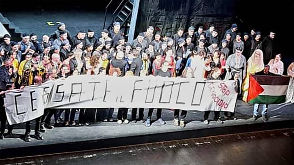Parole a cui fanno eco quelle dell’Associazione Italia-Israele di Livorno, che tramite la sua pagina Facebook denuncia “un’azione fuori contesto culturale, politico ed istituzionale e con l’esposizione di un messaggio completamente imposto al pubblico presente, che era a teatro solo per vedere un’opera lirica, senza alcuna possibilità di contraddittorio o replica di una posizione diversa.”