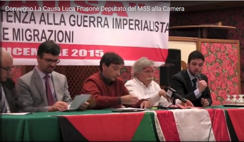 Nell’immagine in alto: Luca Frusone (ultimo a destra), deputato del Movimento Cinque Stelle nonchè membro della commissione Difesa e dell’Assemblea parlamentare della Nato, al tavolo dei relatori sabato 12 Dicembre 2015 a Roma durante il convegno organizzato dalla associazione “Amici del Libano in Italia” con tema “Medio Oriente tra resistenza alla guerra imperialista, caos e migrazioni”