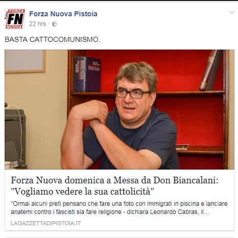 I fascisti di Forza Nuova hanno annunciato il loro arrivo per «vigilare sulla messa». E arrivano, alla fine. Arrivano in quattordici. Passano in mezzo alle urla: «Fuori, fuori!». Vengono accolti dai fischi e dalla stretta di mano di Don Biancalani in persona. «Ragazzi, tranquilli eh», dice il parroco. «Mi raccomando, siamo in chiesa, rispetto. Non tanto per me, ma se vi dichiarate cattolici…». Definirli fascisti non è una forzatura retorica. Loro stessi si presentano così. Entrano in chiesa con croci celtiche al collo e faranno il saluto nazista alla fine, dopo essere passati da una uscita secondaria. Il coordinatore di Forza Nuova in Toscana si chiama Leonardo Cabras. Per giustificare questa irruzione in parrocchia, ha detto: «Siamo cattolici attenti. E una questione identitaria. II nostro prossimo è l’italiano, non il congolese. Noi facciamo resistenza etnica». Cabras è fra i firmatari di una petizione per mettere fuorilegge l’Anpi, l’associazione dei partigiani italiani. Ha partecipato come relatore alla commemorazione per la morte di Mussolini a Firenze. Organizza ronde per la sicurezza in Toscana e paragona la dottrina cattolica di Don Biancalani «alle perverse idee del lobbista Soros». II suo motto è: «Dio patria e famiglia». Adesso è seduto nel terzo banco, alla sinistra del pulpito. Assieme agli altri.