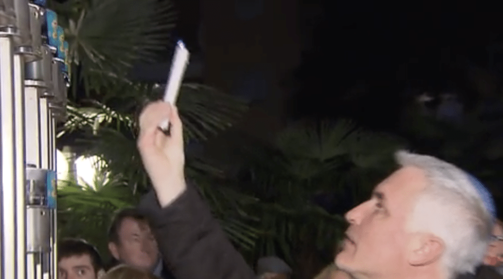 (Nell’immagine: don Gretter mentre accende la Chanukkiah nel giardino della sinagoga di Merano)