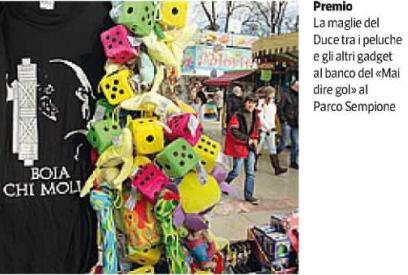 El Shaarawy, Pirlo, Palacio, Tevez. E poi Benito Mussolini. Tra gli idoli dei bambini, a giudicare dai premi in palio al luna park del Sempione – banco «Mai dire goal (o quasi)», ci sarebbe anche lui. Otto palle in rete? Vincita, e si compie la scelta. A sinistra le magliette coi campioni delle varie squadre di calcio. Al centro, pupazzi e orsacchiotti. E a destra sfilza di maglie nere. Primo piano del duce, richiami ad una certa storia, scritte poco amichevoli: «Boia chi molla», «L’Italia soltanto agli italiani», l’«Italia nera». «Vincere e vinceremo». Ma cosa c’entrano in un gioco per bambini?, è la domanda di un papà – l’unico in mezz’ora ad interrogarsi su quello strano spettacolo, tra l’indifferenza degli altri passanti. «Non sono solo per i piccoli, ho tutte le taglie, dalla large alla extra small. Sono apprezzatissime, soprattutto dalle mamme e dalle ragazze», spiega il gestore Remo Miletto, circa 35 anni («ma l’età non si chiede, non sia maleducata»). Insomma, propaganda? «E anche se fosse? Potrei dirle che avevo pure le magliette di Che Guevara e sono finite, ma la verità è un’altra: io tengo ciò che piace. È questione di marketing». E mostra le altre chicche della sua lista premi. Sfondo sempre nero, lato sempre «destro»: «Che dio ce la mandi bbona. E possibilmente in mutande», e «Gli uomini sono come le macchine…», «Bevo soltanto quando guido», o «Per la donna ci vuole il mattarello…». In giro turisti, famiglie, adolescenti. Nessuno si stranisce, alla visione dei premi. Non i genitori, non gli stranieri, non i vicini di banchetto. Tutto permesso, con la crisi? «Ognuno mette in campo ciò che vuole, pur di vendere», alza le spalle Laura Sacchi, impiegata, facendo tirare il pallone al figlio di sei anni (che fortunatamente sceglie in premio la maglietta di Totti). «Se la polizia non dice niente, che problema c’è?», taglia corto anche il venditore di palloncini. Un occhio, andando via, cade sul chiosco dei souvenir. In primo piano campeggia un grembiule, «David di Michelangelo», frecce rosse corrono a mettere in risalto parti del corpo statuario. Milano è anche questa? Modaiola, acculturata e aperta, per qualcuno persino altezzosa. Ma poi, girato l’angolo, irrimediabilmente modesta?
