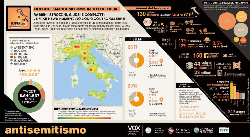 Guardando più da vicino i dati legati all’antisemitismo nel nostro paese, è emerso che dal maggio al novembre 2017 ci sono stati 8.854 tweet negativi contro gli ebrei, mentre dal marzo al maggio 2018 erano 6.566. Essi erano concentrati prevalentemente in 4 città: Milano, Roma, Bologna e Firenze, con picchi minori a Torino, Venezia e Napoli.