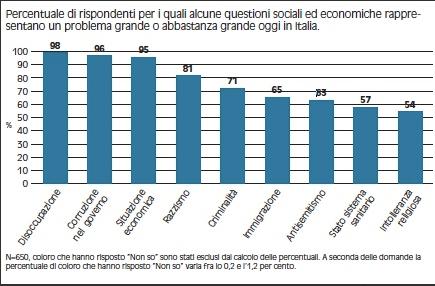 I PROBLEMI REALI – La disoccupazione, la corruzione, la crisi economica, il razzismo, la criminalità e l’immigrazione. Prima di parlare di antisemitismo gli ebrei italiani, come tutti gli altri cittadini italiani, sono preoccupati dai molti dei problemi sociali ed economici che flagellano il paese. L’antisemitismo viene solo in settima posizione, precedendo di poco lo stato dei servizi sanitari e l’intolleranza religiosa. Questo non significa che la minaccia del pregiudizio antisemita non sia avvertita. Il fenomeno è visto in ogni caso come un pericolo reale dal 63 per cento dei rispondenti e costituisce comunque un fattore di rilievo. L’aggravarsi della crisi economica e la mancanza di lavoro per i giovani avranno probabilmente ancora accresciuto in questi ultimi mesi la percezione della drammatica situazione sul mercato del lavoro, che costituisce un pensiero condiviso in pratica da tutti.
