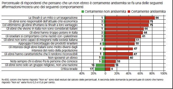 CHI SONO GLI ANTISEMITI – Se l’antisemitismo è una minaccia, gli antisemiti, chi sono? Secondo la percezione degli ebrei italiani i criteri prevalenti che portano all’identificazione di un antisemita passano prima di tutto attraverso la negazione della Shoah. Molto forte anche il campanello d’allarme suscitato da chi vorrebbe attribuire la responsabilità della crisi economica agli ebrei e alla pari viene percepito come un odiatore scoperto chi dichiara che gli ebrei sfrutterebbero il dramma della Shoah per il proprio tornaconto. Ma al di là di questa fascia di possibilità, che mette in evidenza casi oggettivamente devianti, patenti e patologici di odio antisemita, in quali altri atteggiamenti si nasconde l’antisemitismo? Nella fascia intermedia entrano in gioco i pregiudizi sull’identità nazionale ed entra in gioco la strumentalità di chi vuole vedere nella crisi mediorientale una responsabilità di Israele e di conseguenza una responsabilità ebraica. Segue un catalogo di piccole aberrazioni dettate dall’ignoranza e dai millenni di sospetto e di separazione ereditata dalla cultura dominante cattolica. Infine un segno positivo e una prova di grande maturità. la ricerca dimostra che gli ebrei italiani a stragrande maggioranza non temono e non vedono con sospetto chi rivolge alla politica israeliana una critica civile e meditata.