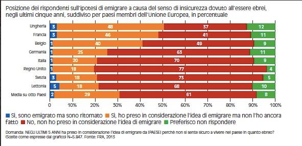 SALIRE IN ISRAELE, FUGGIRE DALL’EUROPA – Il 20 per cento degli ebrei italiani dichiara di aver preso in considerazione la possibilità di lasciare l’Italia per salire in Israele. Una percentuale fra le più basse fra quelle registrate nelle diverse realtà europee e che si piazza molto al di sotto della media europea, attestata sul 29 per cento. E, più che una misura reale di coloro che sono effettivamente disposti a emigrare in Israele, un nuovo fattore di misurazione della percezione dell’antisemitismo. Gli ebrei francesi che dichiaravano di aver preso in considerazione l’aliyah era del 46 per cento (e gli esperti confermano che probabilmente sarà ancora molto più alta oggi, sotto l’effetto dei drammatici fatti di Parigi). In Ungheria questa percentuale arriva addirittura al 48. Molte forte, di converso, la percentuale del 70 per cento di ebrei italiani che esclude di aver preso in considerazione l’aliyah, un numero che nella media europea cala al 61 per cento. Da notare infine che in Italia il 9 per cento degli interrogati su questo punto, estremamente delicato, ha preferito non pronunciarsi. Si tratta di una percentuale lievemente superiore in questo caso alla media europea.