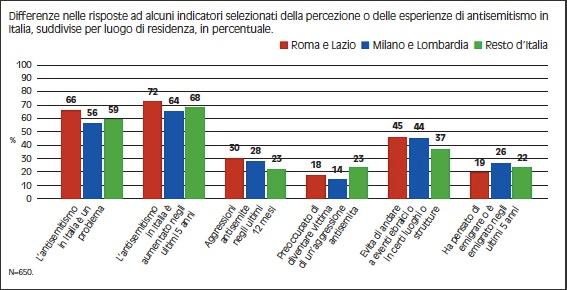 COSA CAMBIA DA ROMA A MILANO – Il rapporto sulla percezione dell’antisemitismo consente fra l’altro anche una lettura sociologica sulla diversa sensibilità manifestata dagli ebrei italiani a seconda dell’area geografica di appartenenza. Appaiono differenze importanti in quanto manifestato dagli ebrei che vivono a Roma, nella maggiore realtà ebraica italiana, in quanto dichiarato dagli ebrei milanese e in quanto avvertito dagli ebrei delle realtà meno numerose. In particolare la percezione di un pericolo di antisemitismo e di una crescita del fenomeno antisemita risulta più acuta nella Capitale. Piuttosto elevata anche la preoccupazione di essere coinvolti in eventi ebraici che potrebbero comportare il rischio potenziale di subire un attacco antisemita. Molto interessanti anche i fattori di differenza che distinguono gli ebrei italiani di fronte alla prospettiva di abbandonare l’Italia per affrontare la salita in Israele. In questo contesto solo il 19 per cento degli ebrei romani dichiara di aver preso in considerazione l’opportunità dell’aliyah negli ultimi cinque anni, contro un ben maggiore 26 per cento espresso dagli ebrei milanesi e un 22 per cento espresso dagli ebrei che vivono nelle comunità minori.