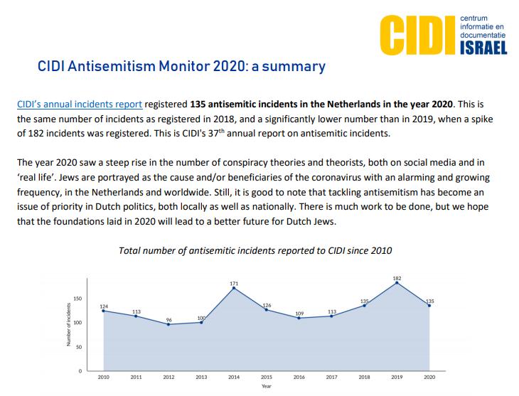 Il CIDI ha registrato 135 episodi antisemiti nel 2020, nel 2019 erano stati 182. Tuttavia, il conteggio del 2020 è identico a quello del 2018 e il terzo più alto dal 2010. Il Centro ha spiegato che il calo degli atteggiamenti antisemiti potrebbe essere legato alla scarsità delle interazioni sociali causato dalla pandemia Covid-19 nel 2020 e alla poca fiducia nella polizia e nell’efficacia delle segnalazioni da parte degli ebrei olandesi.