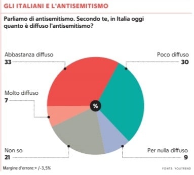 - il 47% degli intervistati sostiene che l’antisemitismo in Italia sia molto diffuso o abbastanza diffuso oggi.