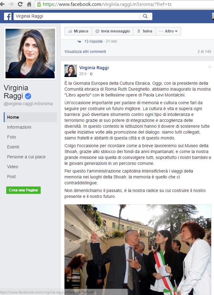 Virginia Raggi aveva appena ricucito con la Comunità ebraica romana, andando ad inaugurare la giornata europea della cultura ebraica e promettendo che i viaggi ad Auschwitz per gli studenti si rifaranno ancora, e confermando l’impegno per il Museo della Shoah, quando è arrivata su Facebook l’ondata di commenti antisemiti, tra cui anche quelli di alcuni sostenitori della Sindaca.