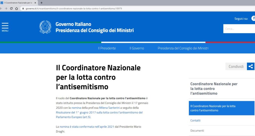Il sito contiene inoltre le iniziative svolte dalla Coordinatrice nazionale contro l’antisemitismo professoressa Milena Santerini.