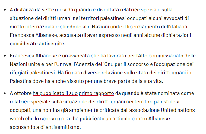 A distanza da sette mesi da quando è diventata relatrice speciale sulla situazione dei diritti umani nei territori palestinesi occupati, alcuni avvocati di diritto internazionale chiedono alle Nazioni unite il licenziamento dell’italiana Francesca Albanese, accusandola di aver fatto negli anni dichiarazioni antisemite. Albanese è un’avvocata che ha lavorato per l’Alto commissariato delle Nazioni unite e per l’Unrwa, l’Agenzia dell’Onu per il soccorso e l’occupazione dei rifugiati palestinesi. Ha firmato diverse relazioni sullo stato dei diritti umani nei Territori palestinesi, dove ha anche vissuto. A ottobre ha pubblicato il suo primo rapporto da quando è stata nominata relatrice. La sua nomina era già stata ampiamente criticata dall’associazione UN Watch, che lo scorso marzo ha pubblicato un articolo accusandola di antisemitismo. Ma qual è il suo ruolo? Il relatore o la relatrice è un esperto indipendente nominato dal Consiglio per i diritti umani dell’Onu con il compito di indagare sui diritti umani nelle aree palestinesi, pubblicare rapporti e collaborare con governi e ong sulla questione. La polemica è arrivata anche sui social con l’avvocato di UN Watch, Hillel Neuer, che ha pubblicato sul suo account un post Facebook di Albanese. Nel tweet Neuer chiede al segretario generale dell’Onu, Antonio Guterres, e ad altri vertici dell’organizzazione il licenziamento per «l’antisemita» Albanese. Il post incriminato 1131 luglio dei 2014 l’avvocata Albanese riportava su Facebook una lettera che affermava di aver indirizzato al vescovo della diocesi della sua famiglia. Nella missiva chiedeva donazioni per l’Unrwa. Dopo un excursus sulla sua esperienza personale in Palestina, Albanese ha scritto: «Mentre i paesi come Perù, Ecuador, Cile e Brasile hanno già condannato il massacro che si va compiendo a Gaza e interrotto tutte le relazioni militari e commerciali con Israele, l’America e l’Europa, soggiogati dalla lobby ebraica gli uni, e dal senso di colpa per l’Olocausto gli altri, restano al margine e continuano a condannare gli oppressi — i palestinesi — che si difendono con i soli mezzi che hanno (missili squinternati), invece di richiamare Israele alle proprie responsabilità secondo la legge internazionale, fare pressioni affinché desista da ulteriori aggressioni e avvii un negoziato di pace serio con i palestinesi». Il resto della lettera enuncia i numeri della crisi umanitaria in corso a Gaza e si conclude con gli estremi dell’Iban e del conto corrente dell’Unrwa al quale inviare le donazioni Ma le sue dichiarazioni sulla lobby ebraica negli Stati Uniti e sul senso di colpa dell’Europa per l’Olocausto sono quelle criticate da United Nations Watch. Il post Facebook è stato ripreso anche da Ruth Dureghello, presidente della comunità ebraica di Roma che in un tweet ha scritto: «Fa rabbrividire sapere che la persona che si dovrebbe occupare dei diritti umani per l’Onu evochi la lobby ebraica e difenda il movimento terroristico di Hamas e le sue azioni. Fa ancora più male sapere che è un’italiana a farlo». Le altre dichiarazioni Neuer ha pubblicato anche un video di Radio Radicale accusando Albanese di aver equiparato l’olocausto all’attuale condizione del popolo palestinese. Nel video, parte di una conferenza online, Albanese ha detto: «Senza voler fare facili equazioni che spesso mi causano molti problemi, così come tragica, terribile, inenarrabile è la tragedia che si è abbattuta sul popolo ebraico con la Shoah, così per i palestinesi la Nakba rappresenta lo sgretolamento del tessuto connettivo di un popolo e lo sgretolamento fisico, istituzionale e la rottura di rapporti famigliari». Secondo Neuer, Albanese ha anche esultato per la rimozione di Hamas da una lista di terroristi e appoggia il loro «diritto a resistere». Il caso è stato anche ampiamente trattato dal Times of Israel e Albanese è consapevole delle critiche rivolte nei suoi confronti. In un’intervista rilasciata all’Altreconomia nella quale le viene chiesto come se ne esce dalle accuse di antisemitismo rivolte a chi spesso critica le misure del governo e dell’esercito israeliano ha risposto: «Se ne esce ascoltando i 300 intellettuali ebrei che hanno firmato la Dichiarazione di Gerusalemme sull’antisemitismo: criticare Israele non è antisemita. Il Bds, il movimento che propone boicottaggio, disinvestimento e sanzioni contro Israele, nemmeno. Antisemita è chi discrimina un ebreo perché tale. Il diritto di pensiero e di critica non possono essere messi in discussione. Il messaggio che passa, così, è che i palestinesi non hanno altro spazio per il dissenso che la violenza. Non è nemmeno corretta l’idea che tutti gli israeliani supportino tale atteggiamento: ci sono accademici, esponenti della società civile e organizzazioni dei diritti israeliane contrarie».