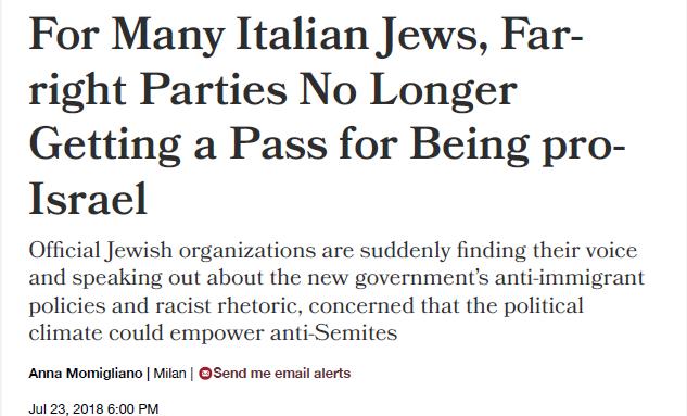 Fiamma Nirenstein, an Italian-Israeli conservative pundit, wrote that “populism is not anti-Semitic,” while Hatikwa – the newspaper of young Italian Jews – published an Op-Ed by young journalist Nathan Greppi urging Jewish leaders not to attack the League. “This government has its supporters inside the Jewish community – not so much the Five Star Movement, but the League does,” said political historian David Bidussa. “Some Jews appreciate the League because they perceive it as being pro-Israel and anti-Islam. Not to mention that they share some skepticism of the European Union because of its criticism of Israel.” The bottom line, Bidussa said, is that “when someone is pro-Israel, that’s still a passport to forgive other sins.”