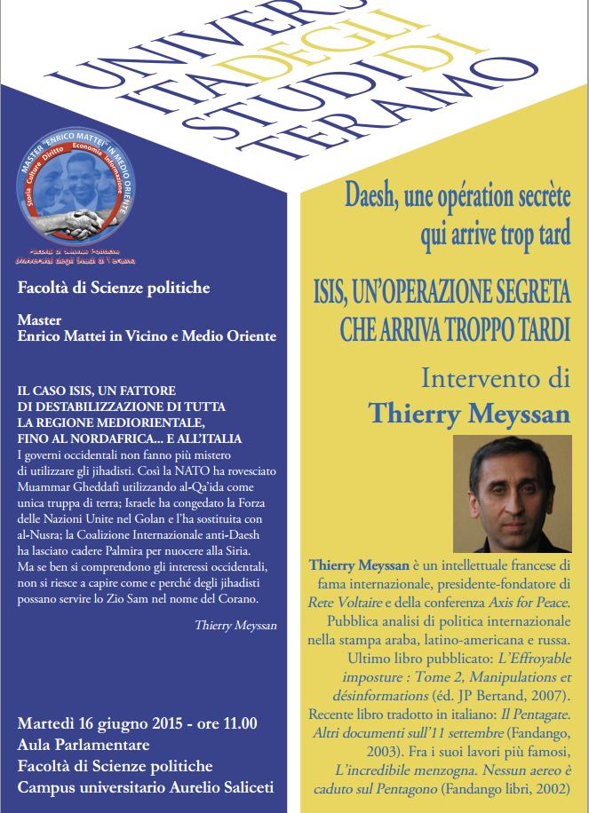 Al via l’ottava edizione del master Enrico Maffei. Multidisciplinarità, pluralismo delle opinioni e analisi a 360 gradi sono i tre principi guida del master Enrico Mattei in Medio Oriente, fondato nel 2006 dal professor Claudio Moffa e giunto all’ottava edizione: “Un solo esempio – dice il docente teramano – la domanda posta da un noto giornalista tre settimane fa sul fatto se ‘Obama stesse veramente combattendo l’Isis’: “ottimo il non fermarsi alle parole. E aggiungo: ma Obama controlla da solo la politica estera Usa? O ha da fare i conti con i media e i gruppi di pressione dentro la sua amministrazione? Come spiegare altrimenti il suo conflitto con la Clinton, e il succedersi di ministri della difesa come Panetta, e poi il pro-arabo Hagel, e poi ancora Carter Ashton, anti-Isis, ma anche antirusso e antiraniano? La complessità degli scenari mediorientali è nota, e dunque il nostro obiettivo è un’offerta formativa che riesca ad andare anche oltre i luoghi comuni e le cose non dette”