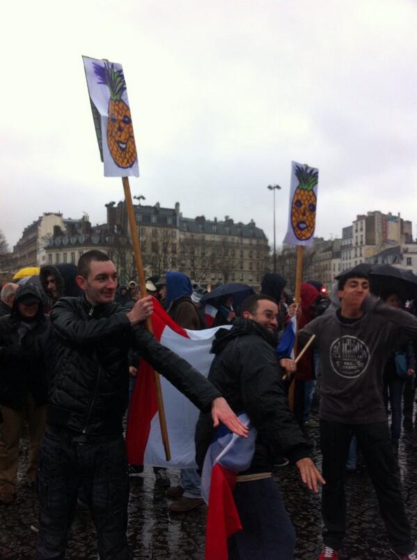 The catalyst for the gathering of such strange bedfellows is the self-proclaimed humorist, Dieudonné M’bala M’bala. First a Socialist party candidate, then founder of the Anti-Zionist List for the last European Parliamentary elections, serially convicted for Holocaust denial and anti-Semitic incitement, and now father of the quenelle. Along the way, he has vaunted his close relationship with National Front founder, Jean-Marie Le Pen and former Iranian President Ahmadinejad.