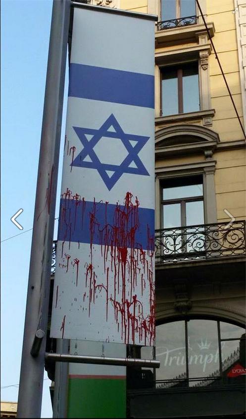 Stampa 23 Marzo 2015 Per la quarta volta imbrattata la bandiera di Israele in via Dante Fonte: Facebook Autore: Ruggero Gabbai Macchiata con vernice rossa la bandiera di Israele È la quarta volta che viene imbrattata con vernice rossa la bandiera dello Stato di Israele esposta nella centrale via Dante a Milano.