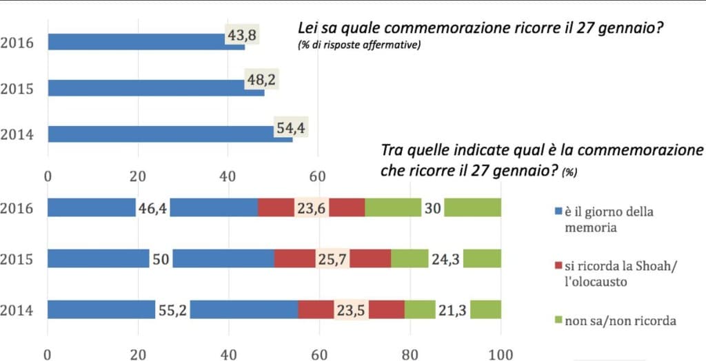 In particolare la risposta affermativa alla domanda “Lei sa quale commemorazione ricorre il 27 gennaio” si attesta ora al 43,8 per cento (era il 48,2 un anno fa e il 54,4 nel 2014).