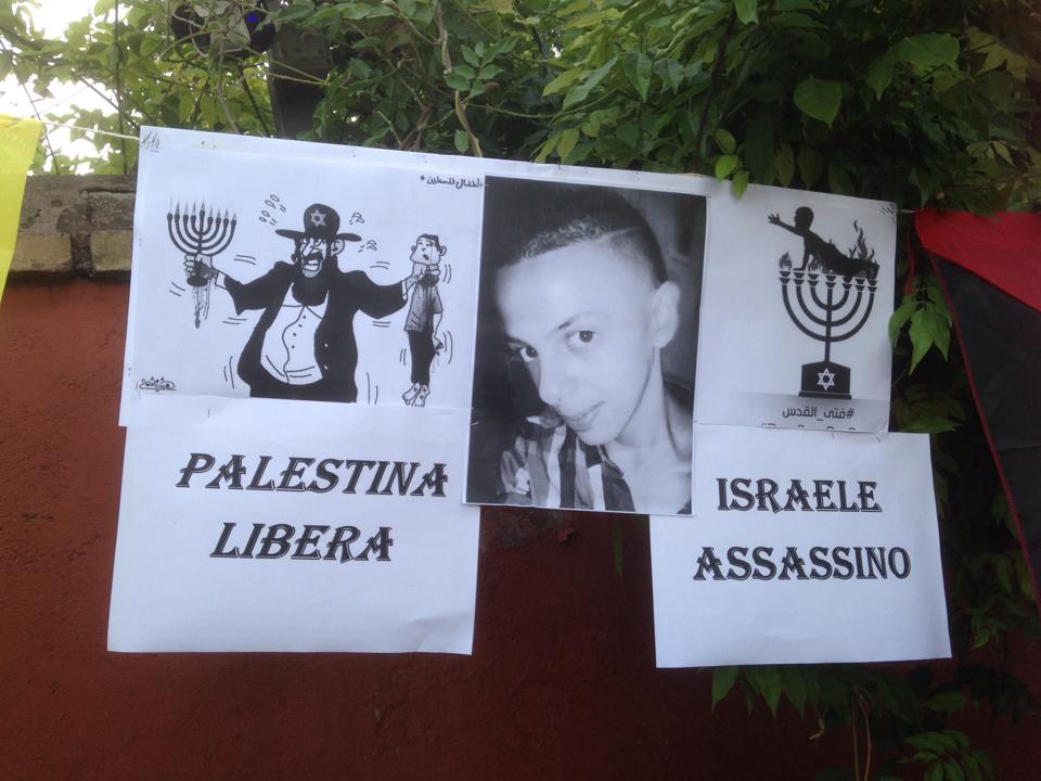 Una foto di Mohammed, il ragazzo palestinese bruciato vivo pochi giorni fa a Gerusalemme, due caricature di chiaro sapore antisemita, e le scritte “Palestina libera” e “Israele assassino” : è il cartello, messo insieme con una serie di fogli stampati, comparso ieri in una foto-denuncia diffusa su Twitter dal portavoce e consigliere politico dell’ambasciata d’Israele a Roma, Amit Zarouk. Secondo quest’ultimo, sarebbe stata esposta fuori dalla sede diplomatica palestinese in viale Guido Baccalli, nei pressi del Circo Massimo.