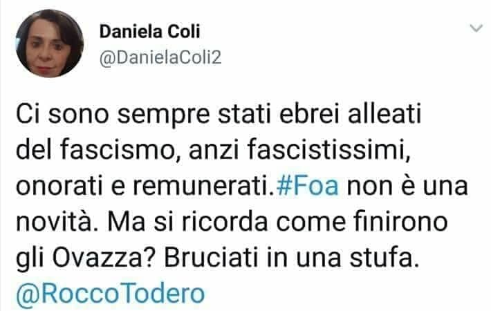 Marcello Foa, designato alla guida della Rai Un tweet che diventa un caso politico nazionale. Protagonista, una docente di storia della filosofia politica dell’Università di Firenze, la professoressa Daniela Coli, che, accusando Marcello Foa, candidato alla presidenza della Rai, di comportarsi come gli ebrei che collaborarono col fascismo, ha scritto sulla sua pagina Twitter «Ci sono sempre stati ebrei alleati del fascismo, anzi fascistissimi, onorati e remunerati. Foa non è una novità. Ma si ricorda come finirono gli Ovazza? Bruciati in una stufa». Coli si riferisce all’ebreo Ettore Ovazza che partecipò alla marcia su Roma, fu iscritto a Pnf, ma finì catturato dalle Ss, fucilato e il suo cadavere bruciato nella stufa di una scuola. Prima di ucciderlo, fu costretto a confessare dove era nascosta la sua famiglia, che fu poi catturata e subì la stessa identica sorte. Il tweet della docente fa il giro del web e viene messo sotto accusa non tanto per l’accostamento dell’attuale governo al fascismo, quanto per il riferimento alla stufa, interpretato da alcuni come «un incitamento all’odio e alla violenza». E in molti chiedono il licenziamento della professoressa. La storica della filosofia precisa che il suo intento non era augurarsi che Foa finisse in una stufa, ma l’esatto contrario: «Non bisogna dire a un ebreo di stare in guardia a stare con i fascisti?». Il cinguettio, però, arriva fino in Parlamento. E Guido Crosetto, deputato di Fratelli d’Italia, tuona contro la professoressa Daniela Coli: «Non si può accettare che la polemica politica o partitica arrivi a questo livello. Non si può accettare da nessuno, figuriamoci da una docente universitaria!».