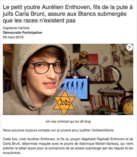 Attivissimo sui social, Aurelien,16 anni, figlio di Carla Bruni e del filosofo Raphael Enthoven, è oggetto di un’ondata di messaggi razzisti – insulti e molte minacce – dopo aver postato un tweet in cui dimostrava che il razzismo è un’ideologia senza alcun fondamento biologico. Centinaia di messaggi di insulti hanno preso di mira il ragazzo da circa 10 giorni. Il figlio che Carla Bruni ebbe prima del matrimonio con Nicolas Sarkozy nel suo post smontava soprattutto le tesi dello psicologo britannico Richard Lynn, con l’aiuto di un amico che si fa chiamare «pensatore selvaggio». Antisemitismo, razzismo e varie teorie complottiste venivano prese di mira dai due ragazzi, immediatamente investiti da centinaia e centinaia di messaggi di insulti, almeno 100 di «minacce gravi». Carla Bruni, si è detta «fiera» della battaglia del figlio. La ministra dell’Educazione, Marlene Schiappa, e l’ex premier Manuel Valls hanno condannato queste manifestazioni.