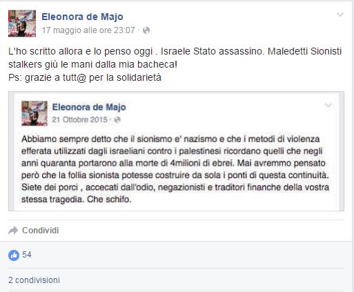 «Siete dei porci, accecati dall’odio, negazionisti e traditori anche della vostra stessa tragedia. Che schifo». Si conclude così il lungo messaggio pubblicato da Eleonora De Majo il 21 ottobre del 2015 sulla sua pagina Facebook all’indirizzo degli israeliani. Studentessa universitaria, compagna del leader indiscusso degli antagonisti napoletani Egidio Giordano, De Majo oggi è candidata al consiglio comunale di Napoli per Democrazia Autonoma, lista arancione che sostiene Luigi De Magistris. E sugli israeliani lo scorso autunno scriveva questi giudizi: «Il sionismo è nazismo, i metodi di violenza efferata utilizzati dagli israeliani contro i palestinesi ricordano quelli che portarono alla morte di quattro milioni di ebrei. Mai avremmo pensato però che la follia sionista potesse costruire da sola i ponti di questa continuità». Non solo. Il 27 gennaio, nel giorno della memoria delle vittime dell’Olocausto, De Majo scriveva: «Israeliano scatta foto ricordo al cadavere di un giovane palestinese appena ammazzato. La memoria a chi la merita. Buon 27 gennaio». Lei, come altri che si candidano per De Magistris, proviene da «Insurgencia», centro sociale partenopeo vicinissimo al sindaco di Napoli. Arriva da lì anche Ivo Poggiani, anche lui candidato, in prima fila negli scontri in occasione della visita di Renzi a Bagnoli. A sostegno del sindaco anche Rosa Schiano, attivista fotografata a Gaza mentre faceva il segno della vittoria in mezzo a un gruppo di uomini armati e col volto coperto. Un rapporto, quello tra il sindaco e i centri sociali, che si sta rinsaldando ora in prossimità del voto, ma che durante il mandato del sindaco si è rafforzato via via, quando ai collettivi è stato lasciato in gestione l’Asilo Filangeri o l’ex ospedale psichiatrico giudiziario. Il tutto tenuto assieme dalla comune causa anti-israeliana e anti-sionista. Basta una notazione: nel 2013 De Magistris ha conferito la cittadinanza onoraria di Napoli ad Abu Mazen, cortesia che gli è stata restituita nel dicembre dello stesso anno a Betlemme dall’autorità palestinese. E nella tarda serata di ieri il sindaco, durante un evento elettorale dedicato alla «shoah palestinese», ha ribadito vicinanza a Rosa Schiano, spiegando che «fin quando non si darà dignità a un popolo oppresso la città sarà schierata al fianco dei palestinesi», aggiungendo di avere messo in bella vista sulla sua scrivania «il passaporto palestinese».