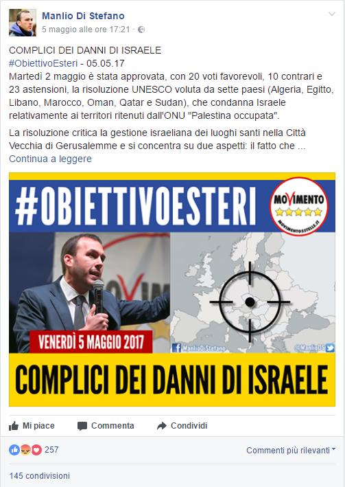 Il post pubblicato da Manlio Di Stefano su Facebook «Complici di Israele», sul voto contrario dell’Italia alla risoluzione Unesco su Gerusalemme, ha dato vita a un acceso dibattito, tra chi si dichiarava d’accordo con il parlamentare 5 stelle e altri interventi polemici. E tra i commenti è spuntata anche una lista di personalità di religione ebraica, giornalisti, scrittori, attori. «Influenza sionista nei media italiani», si legge, e poi nomi e cognomi, da Roberto Saviano, a Paolo Mieli, da Enrico Mentana a Gad Lerner. Il commento, postato sulla pagina Facebook di Di Stefano da Giancarlo Pezzano, riprende un elenco che già finì al centro delle polemiche, quella «lista di proscrizione» sulla quale la Procura, nel dicembre 2015, aprì un fascicolo per minacce e diffamazione, con l’aggravante dell’odio razziale. «Non modero i commenti, il dibattito è aperto sulla mia pagina Facebook», commenta il parlamentare, che ha avuto un ruolo di primo piano nella stesura del programma esteri del Movimento. Neanche se compaiono nomi e cognomi in una «black list»? «Chi scrive se ne assume la piena responsabilità». In ogni caso, non sarà cancellato: «Non cancello i commenti. Non lo faccio mai». Re. B.