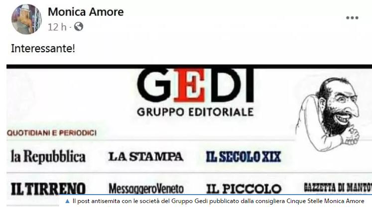 “Quelle sono le vignette della propaganda antisemita nazifascista. Questa consigliera occupa indegnamente un posto nelle istituzioni cittadine. E se non è in grado di comprenderlo lei deve esserlo il Movimento che l’ha candidata ed eletta”. Così il presidente della Comunità ebraica di Torino Dario Disegni, intervenendo sul vergognoso episodio legato alla consigliera comunale Cinque Stelle, Monica Amore (La Stampa, Repubblica Torino, Corriere Torino). Quest’ultima, sulla sua bacheca Facebook, ha pubblicato una vignetta chiaramente antisemita per attaccare il gruppo Gedi. La consigliera ha poi parlato di una “svista” e ha affermato di aver “peccato di superficialità” (La Stampa Torino). Ma Disegni, che ha ricevuto la telefonata di solidarietà della sindaca Cinque Stelle Chiara Appendino, ha chiesto al Movimento di prendere provvedimenti severi e le dimissioni immediate.
