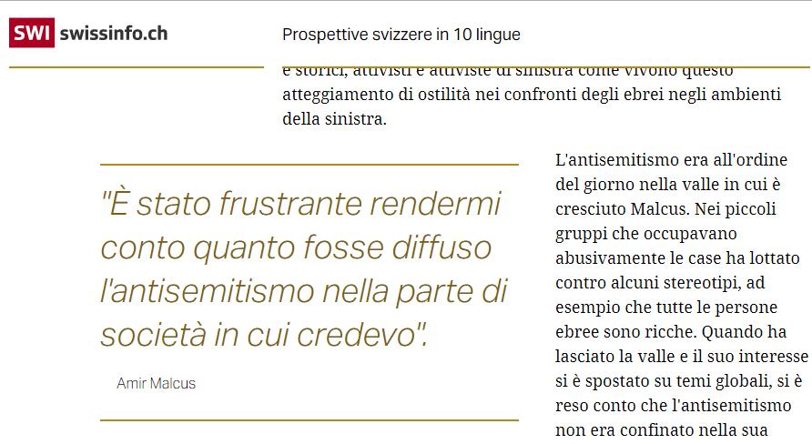 Stando al responsabile supplente del Centro di studi ebraici dell’Università di Berna Erik Petry, bisogna valutare caso per caso. “Spesso c’è una miscela tossica che non si fonda su una critica alla politica dello Stato, bensì sulla supposizione che alla base ci sia un comportamento immorale che abbia a che vedere con il fatto di essere ebreo”. Ed è ciò che Petry individua spesso nella sinistra.