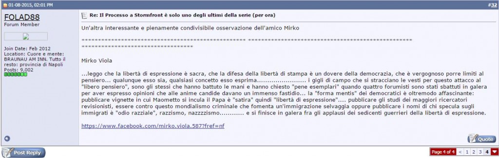 Richiesta di rinvio a giudizio per 39 persone coinvolte nell’inchiesta sul sito antisemita e neonazista Stormfront sul quale da diversi anni indaga la procura di Roma. Come spiega Repubblica, gli indagati sono accusati — a seconda delle posizioni — “di reati che vanno dalla diffusione di idee fondate sull’odio razziale ed etnico alla diffamazione e alle minacce”. Quella conclusa dal pubblico ministero Luca Tescaroli costituisce un’ulteriore parte dell’indagine che nel novembre 2012 portò all’arresto di quattro persone e alla condanna di Daniele Scarpino (ritenuto l’ideologo del gruppo) a due anni e mezzo di reclusione, di Diego Masi (uno dei moderatori del sito), Luca Ciampaglia e Mirko Viola a due anni e due mesi.
