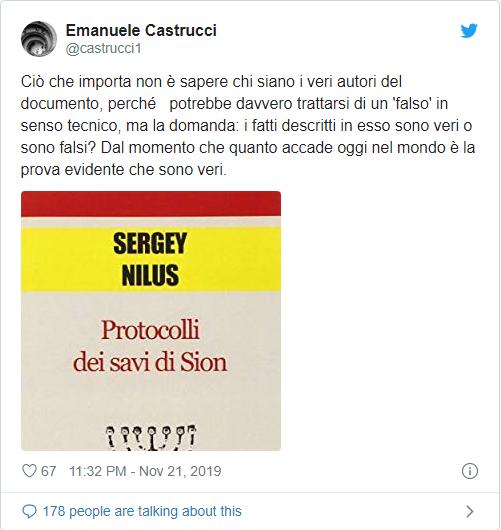 Propaganda e istigazione a delinquere per motivi di discriminazione razziale etnica e religiosa, aggravata da negazionismo il reato contestato dagli inquirenti al professore dell’Università di Siena al centro delle cronache per le frasi a favore di Hitler pubblicate su Twitter. Il suo account è stato chiuso mentre stamani – riporta il Corriere Fiorentino – si riunirà il Consiglio di Giurisprudenza, il rettore Frati ha sottolineato che “in attesa del pronunciamento della Commissione di disciplina sulla proposta di destituzione di Castrucci, gli uffici legali stiano valutando l’ipotesi della sospensione cautelativa”. Per dare un segnale concreto, la presidente UCEI Noemi Di Segni ha chiesto al mondo accademico di adottare la definizione di antisemitismo dell’IHRA. Non tutto può essere considerato libertà di pensiero, scrive Gian Antonio Stella sul Corriere. Il quotidiano pubblica anche un editoriale – a firma di Riccardo Saccenti – in cui si afferma che la vicenda di Siena (su cui riflette anche Corrado Augias su Repubblica) può servire per tornare a confrontarsi sul problema antisemitismo. (Bokertov, 4 dicembre 2019)
