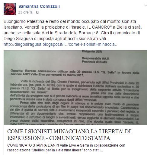 Un film dal titolo infame si aggira per l’Italia. E si trasforma in una cartina di tornasole sulla confusione mentale di un pezzo della sinistra nostrana, a cominciare dall’Anpi, la benemerita associazione dei partigiani. Si chiama «Israele, il cancro» la pellicola di Samantha Comizzoli, attivista già arrestata e rimpatriata nel 2015, così devota alla causa palestinese da augurarsi che lo Stato dalla Stella di David possa «sprofondare all’inferno». E racconta, parole della regista, «l’occupazione nazista israeliana della Palestina». Non esattamente un punto di vista sereno sul conflitto più drammatico del Medio Oriente da settant’anni a questa parte. La Comizzoli sostiene che il suo film spaventi noi sepolcri imbiancati perché «crudamente oggettivo». E, per dimostrare la propria oggettività, lancia sin dal trailer su uno schermo nero la seguente frase: «L’effetto del mostro Israele sulla mente delle vittime, il popolo palestinese». Seguono le fasi della «malattia» che progredisce come una metastasi, appunto: soldati di Tsahal che spianano i mitra su palestinesi indifesi, giovani palestinesi costretti su sedie a rotelle, braccia palestinesi mozzate in ospedale, rivolte palestinesi basate su gran scritte di protesta contro il famigerato Muro. Infine la domanda: «Come vincere il cancro Israele?». E la ricetta: «Non ho paura di Israele, la mia pietra fermi i loro proiettili!», proclama una nonnina lanciando in aria il sasso della prossima Intifada. Intendiamoci: solo un cieco può negare le sofferenze dei palestinesi. Ma negare quelle degli ebrei non restituisce la vista. Settant’anni di terrorismo antisemita, massacri di civili israeliani sugli autobus e nei locali, il lavaggio del cervello ai «martiri» e alle loro famiglie, i missili hezbollah sui kibbutz di confine, una guerra di sopravvivenza che dal 1948 lo Stato israeliano deve combattere solo per restare sulle cartine geografiche: nel «cancro Israele» tutto questo non pare compreso. Ora, che un film simile possa essere proiettato in una scuola sia pure fuori orario di lezione (era in programma per domani al «Quintino Sella» di Biella) è già un’idea bizzarra. Ma che possa godere addirittura del patrocinio della locale sezione dell’Anpi (la «Valle Elvo e Serra»), è sconcertante. L’happening antisemita viene bloccato dalla Provincia, che sulle scuole è competente. Ma la presidente delle comunità ebraiche italiane, Noemi Di Segni, scrive il suo sdegno a Carlo Smuraglia: «Fatto gravissimo». Il presidente dell’Anpi nazionale le risponde con molta cautela: «Una sezione non si identifica con l’Anpi… manifestazioni di disprezzo e odio ritengo non servano mai a nessuna causa». Non «servono», e basta? È la stessa grande cautela con cui ancora l’anno scorso Smuraglia ha derubricato a «piccola macchia» la consueta, vergognosa contestazione del 25 aprile contro la Brigata Ebraica (pur ammonendo che «chi non accetta gli ebrei ignora la storia», e ci mancherebbe). Tanti equilibrismi si spiegano anche con la mutazione genetica dell’Anpi, decisa al congresso di Chianciano del 2006 per ovvi motivi di anagrafe e sopravvivenza. L’associazione si è aperta a sinistra, riguadagnando nei tre anni successivi trentamila iscritti tra i «giovani antifascisti», schiudendosi La vicenda a istanze nobilissime della nostra democrazia ma accentuando anche il suo carattere di fazione (la guerra di liberazione fu viceversa unitaria e sfociò non a caso nel Cln): un marchio prezioso, insomma, che può coprire però identità diverse. Una di queste identità appartiene a quella sinistra che tra una democrazia pur imperfetta come Israele (addirittura di originaria ispirazione socialista) e le dittature o le metastasi teocrazie che la circondano sceglie sempre le seconde, in nome di uno stantio riflesso antiamericano (appoggio peraltro, quello Usa, nient’affatto scontato alla nascita dello Stato kibbutziano). Il percorso tutt’altro che clandestino del film della Comizzoli ben ci descrive questo milieu. Dall’esordio, quasi due anni fa, in una prestigiosa sala comunale nella Napoli di de Magistris, al passaggio a Recanati (ancora sala comunale, sindaco pd) e l’incontro in via via in circoli Arci e ancora un circolo Arci con l’appoggio di sezioni locali Anpi. Neppure stavolta l’Anpi locale demorde: il film, annuncia il sito biellese, si proietta comunque domani, stessa ora, ennesimo circolo Arci. L’odio non «servirà», come dice Smuraglia, ma è una droga potente: difficile smettere.