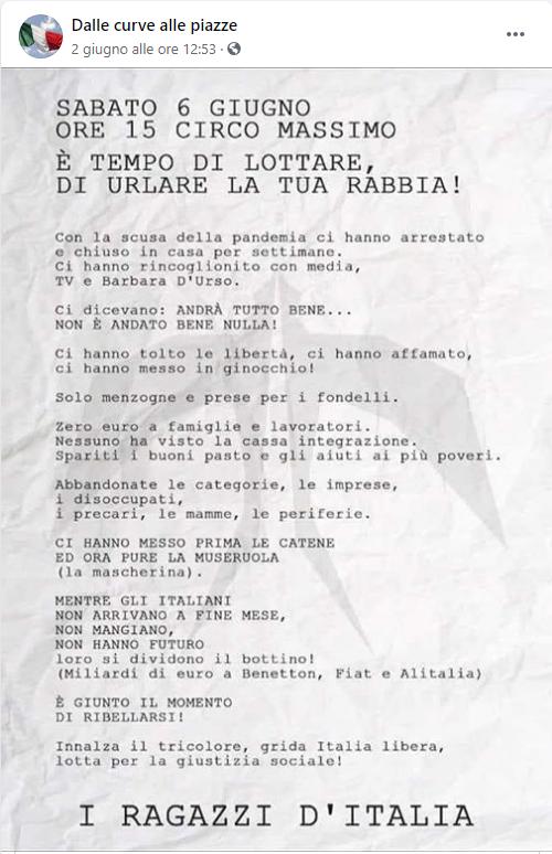 “E Roma sia, stiamo arrivando merde!”. “Le piazze diventeranno il vostro incubo”. “Preparatevi alla battaglia”. E ancora. “Partiamo dalle curve per infiammare le strade”. “Monta la rabbia, l’onda nera pronta alla battaglia”. “Andiamo a Roma così, poi vediamo se il governo non cade subito”. Slogan corredati da fotografie di rivolte e scontri. E da un’istruzione per l’uso: “Scegliere la mascherina!” (immagini di vari modelli di passamontagna, ndr). Al netto della retorica tribale degli ultrà, il messaggio è dritto. Basta sfogliare la pagina Facebook “Dalle curve alle piazze”: è tutto lì. Ma a preoccupare non è solo e tanto ciò che scrivono sui social (proclami minatori anche contro polizia e carabinieri). A preoccupare è quello che potrebbero davvero provare a fare, e che ovviamente non dicono. Men che meno alla questura di Roma. Alla quale, in teoria, avrebbero già dovuto chiedere l’autorizzazione a manifestare (ma nessuno, ieri sera, si era ancora fatto vivo a via San Vitale). Eppure la manifestazione anti-governativa a Roma dei Ragazzi d’Italia — un network di gruppi ultrà neofascisti che unisce le curve più a destra del panorama del calcio italiano — è confermata: appuntamento sabato alle 15 al Circo Massimo. Un luogo simbolico. Casualmente, lo stesso dove il 4 luglio si riunirà, sempre per protestare contro il governo Conte, la destra sovranista di Fratelli d’Italia e Lega (già all’assalto del 2 giugno con i gilet arancione di Pappalardo). Sull’annunciata discesa in campo (politico) degli ultrà —Repubblica ne ha dato notizia il 20 maggio spiegando il caso, finora unico, di sconfinamento delle curve dagli stadi alla piazza. senza precedenti nei quasi sessant’anni di storia degli ultrà italiani — grava una nebulosa di informazioni. E qualcuno, tra gli operatori di polizia, la ritiene, sperando di sbagliarsi, «non un bel segnale». Che raduno sarà quello del Circo Massimo? «Ci stiamo lavorando», si limitano a dire in questura. Ufficialmente l’unico dato in mano alla Digos è che un fronte formato da ultrà e militanti politici ha deciso — l’annuncio risale a metà maggio — di radunarsi a Roma. Con in mente un piano: provare a cavalcare le tensioni sociali e la protesta politica post-coronavirus. Da protagonisti. «La nostra è una manifestazione contro la politica. Gli ultrà ci hanno aiutato a diffondere questo messaggio. Siamo ragazzi italiani, cittadini comuni di ogni tipo che sono stanchi di essere presi per il culo». Parole di “Aquila”: alias di Stefano Paderni, da Passirano, Brescia. Uno dei capi della fazione più nera della curva nord bresciana, assieme al già daspato Enzo Ghidesi. La Nord dove si posizionano anche i camerati di Brigata Leonessa. Dei “Ragazzi d’Italia” (filorussi come molti neofascisti italiani) “Aquila” Paderni è uno dei portavoce. Da loro, e dai militanti neonazisti del Veneto Fronte Skinhead, è nata l’idea di riunire a Roma le tifoserie di estrema destra. Per dare un “segnale forte” al governo e al “sistema”. Il passaparola ha preso piede: Varese, Verona, Padova, Udine, Genova, Bologna, Piacenza, Torino, Milano, Ascoli. E Roma. Nella capitale è data per certa l’adesione degli Ultras Lazio (eredi degli Irriducibili di Fabrizio Piscitelli). A loro potrebbero unirsi anche esponenti delle frange più nere della Sud romanista. Tra i gruppi ultrà di Lazio e Roma la presenza dell’estrema destra è capillare: Forza Nuova e CasaPound hanno solidi punti di riferimento, sugli spalti raccolgono militanti. E così pure la neonata Rete delle comunità forzanoviste (gli scissionisti di FN) e le altre sigle delle teste rasate romane (Avanguardia e Rivolta Nazionale, del neonazi Simone Crescenzi). Braccia tese e svastiche, razzismo e antisemitismo: è la politica delle curve in fondo a destra. Dove si schierano anche militanti di movimenti come Lealtà Azione (Milano) e Fortezza Europa (Verona) — ne abbiamo parlato in altre occasioni. Adesso il nuovo nemico è il governo, sull’onda del disagio legato alla crisi economica post Covid. I capi ultrà fomentano *** disoccupati, lavoratori in crisi, populisti da strada. “La classe politica dovrà pagarla, ma non faremo sconti nemmeno alle forze dell’ordine”: sempre dalla pagina Dalle curve alle piazze. La chiamata a raccolta è un volantino. “Sabato 6 giugno ore 15 Circo Massimo. È il tempo di lottare, di urlare la tua rabbia”. Ragiona Maurizio Marinelli, docente di sociologia dello sport all’università di Brescia, già direttore del Centro studi della polizia: «Il passaggio degli ultrà dalle questioni del calcio alla politica è un segnale. Se si dovesse arrivare a una fase più avanzata, potrebbe trasformarsi in un fattore di rischio sociale».