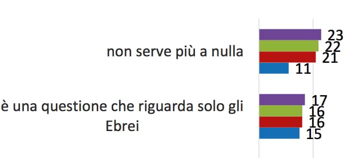 Il dato maggiormente inquietante, fra i tanti che la ricerca comprende, è il raddoppio in quattro anni degli italiani manifestamente ostili al lavoro sulla Memoria stabilito dalla legge dello Stato. Ad affermare che “Il Giorno della Memoria “non serve più a nulla” era l’11 per cento della popolazione nel 2014 e sarebbe il 23 per cento nel 2017. Si tratta di un fenomeno inquietante e purtroppo da prendere molto sul serio, costantemente in crescita e costantemente confermato da quattro anni di rilievi. Un’espressione che va ben al di là dello scetticismo generico, ma che rappresenta una forma di ostilità alla cultura e alla coscienza della Storia e della Giustizia capace di coinvolgere quasi un quarto della pubblica opinione.