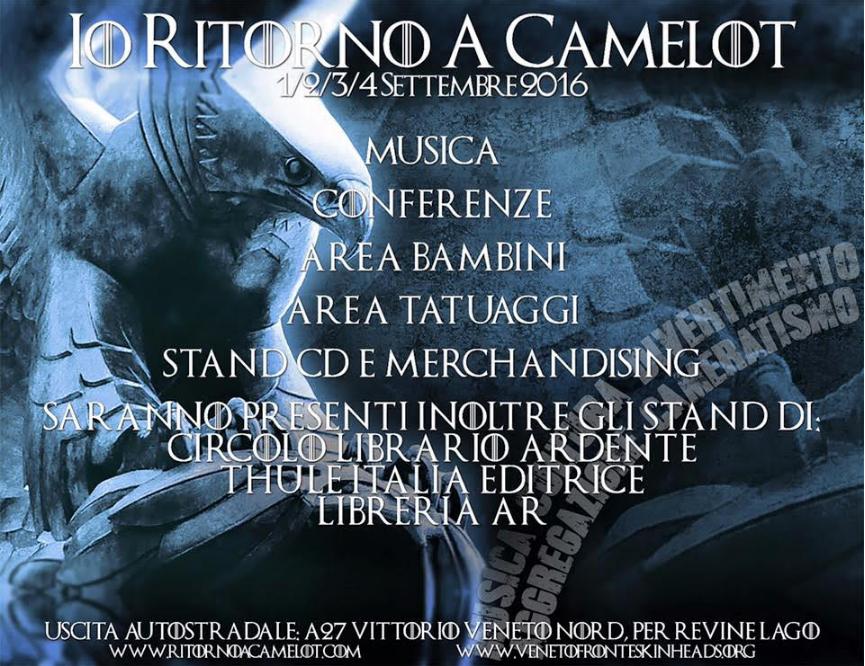 Da ieri, 1 settembre, a domenica 1 settembre a Revine Lago (Treviso), viso), in un’area privata, si svolge «Ritorno a Camelot», il raduno neonazista, che favoleggiando riguardo al mitico regno di Re Artù da restaurare si ripete ogni cinque anni, alternando concerti e conferenze. A promuoverlo il Veneto fronte skinheads, in occasione del trentesimo della sua fondazione, capostipite in Italia del movimento naziskin. Il titolo dell’edizione di quest’anno è «Noi siamo Europa», sottotitolo «Un origine e un destino sotto attacco». Il contenuto è ben spiegato dal manifesto che pubblicizza l’evento: «Decenni di politiche di annientamento identitario, di false integrazioni, hanno portato l’intera Europa sull’orlo di una guerra civile endemica e senza quartiere» a causa di «scellerate politiche immigratorie e sociali», terminando con i versi di una canzone dei Peggior Amico, storica band degli skinheads vicentini e degli ultra veronesi, «Voi figli di una terra che non amate più/ sull’orlo della fossa seduti a guardare giù/ con la vostra umanità, con la vostra carità/ sputerete insieme agli altri/ sulla nostra civiltà». Non per nulla un’altra canzone della stessa band si intitolava «Colpevole di essere bianco».