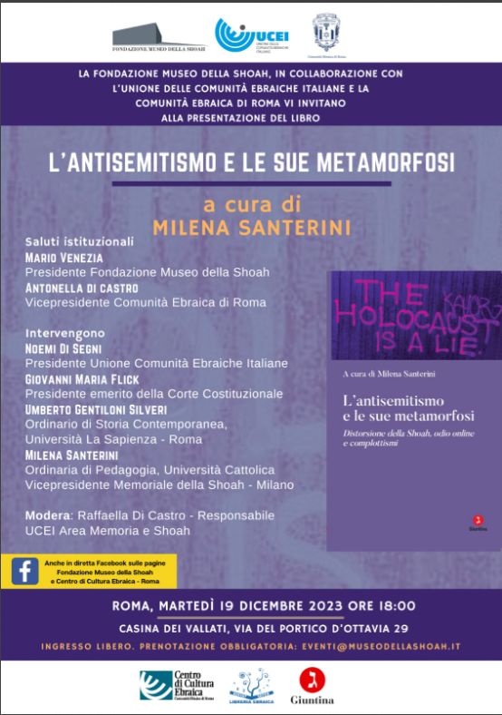 Analizzare le molteplici forme e le declinazioni dell’ostilità antiebraica attraverso il contributo di numerosi esperti del settore. Questo è l’obiettivo del volume “L’antisemitismo e le sue metamorfosi”, una raccolta di saggi curata da Milena Santerini per la casa editrice Giuntina, che è stato presentato presso la Casina dei Vallati dalla Fondazione Museo della Shoah, in collaborazione con il Centro di Cultura Ebraica e la Libreria Ebraica Kiryat Sefer. Una riflessione corale di grande attualità in un momento in cui l’antisemitismo si riaffaccia in modo aggressivo in tutta Europa.