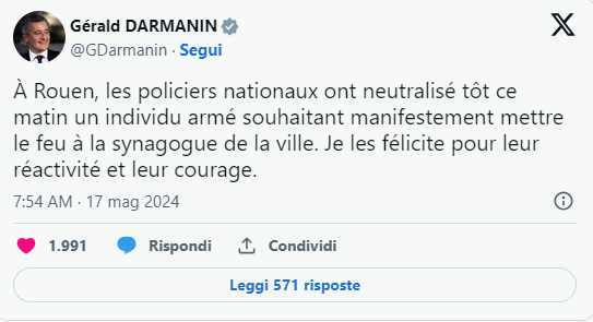 “Questa mattina presto, la polizia nazionale di Rouen ha neutralizzato un individuo armato che era chiaramente intenzionato a dare fuoco alla sinagoga della città. Mi congratulo con loro per la prontezza e il coraggio dimostrati”, ha scritto su X il ministro dell’Interno francese, Gérald Darmanin. L’uomo non aveva con sé alcun documento di identità. Sono attualmente in corso controlli, attraverso le impronte digitali, per identificarlo. Il sindaco di Rouen, Nicolas Mayer-Rossignol, ha dichiarato sui social che il tentativo di incendio è stato domato dai vigili del fuoco e che non ci sono state altre vittime oltre all’aggressore. “Pieno sostegno alla comunità ebraica di Rouen”, ha aggiunto il primo cittadino.