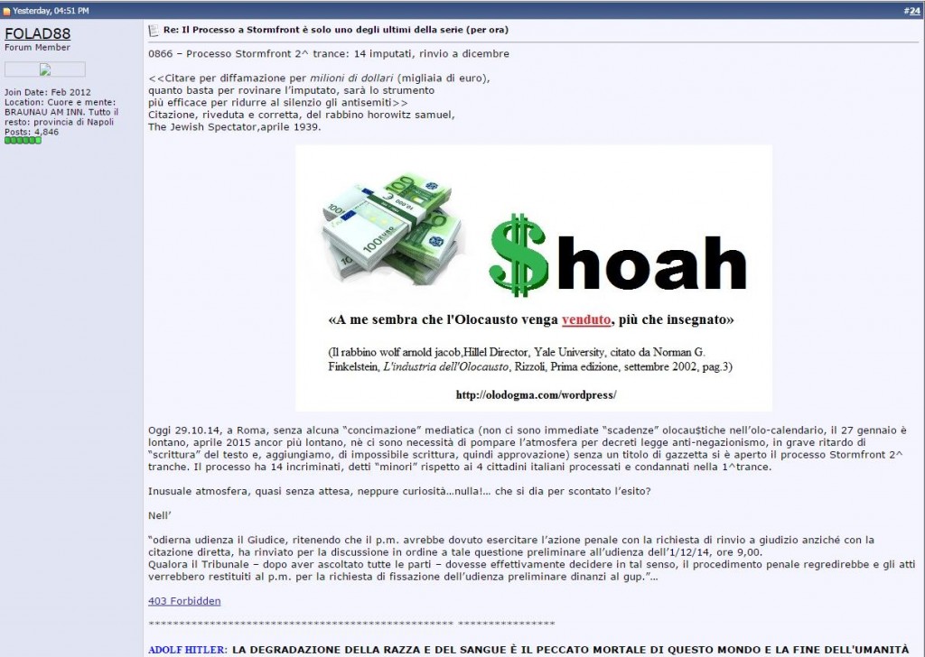 Il tenore dei post e dei commenti su Stormfront sono, secondo la magistratura romana, la prova evidente della violenza nei confronti della comunità ebraica