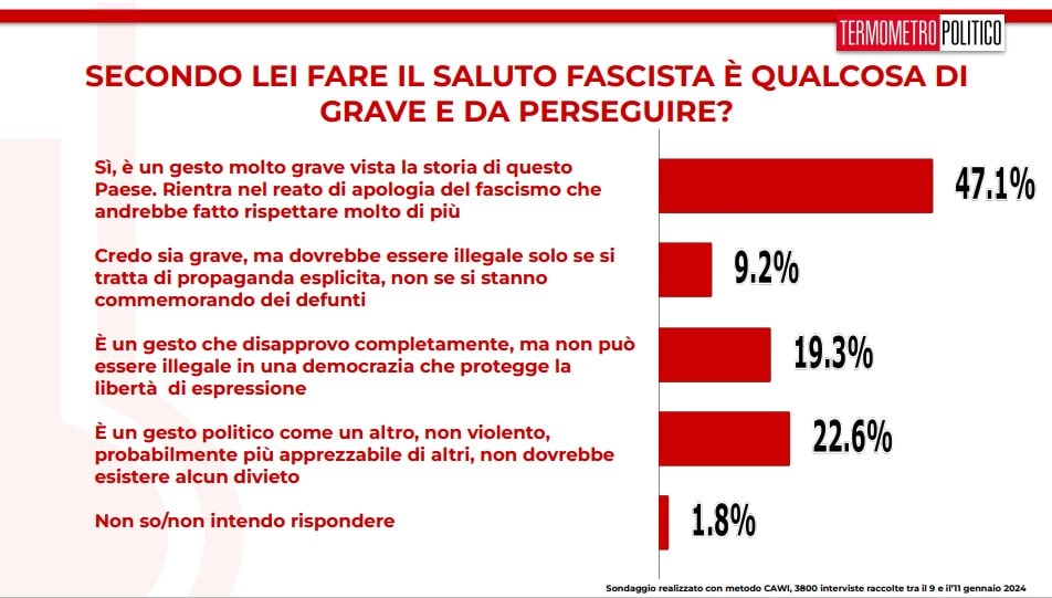 La metà dei rispondenti crede che “Sì, è un gesto molto grave vista la storia di questo Paese. Rientra nel reato di apologia del fascismo che andrebbe fatto rispettare molto di più”. Parliamo di un buon 47,1% che risponde in questo modo. Largamente staccato ma come seconda risposta più gettonata (22,6%) c’è quella che, invece, vede nel saluto romano “un gesto politico come un altro, non violento, probabilmente più apprezzabile di altri, non dovrebbe esistere alcun divieto”.