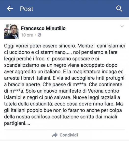 Bologna. «Solo un nuovo manifesto di Verona contro islamici e negri ci può salvare. Nuove leggi razziali e tutela della cristianità: ecco cosa dovremmo fare. Ma gli italiani popolo bue non lo faranno anche per colpa della nostra schifosa costituzione scritta dai maiali partigiani». Sono le parole scritte sul proprio profilo Facebook da Francesco Minutillo, segretario ravennate di Fratelli d’Italia che nei giorni scorsi ha pubblicato un post, poi rimosso. Ma del suo post ha parlato in un’intervista al programma radiofonico «La Zanzara» e in una a «il Resto del Carlino» di Forlì, dove ha invocato la chiusura delle moschee, il controllo di tutti i musulmani e citato più volte Hitler. Le sue posizioni hanno provocato numerose condanne. Minutillo ha rilanciato la polemica. «E poi parlano di Costituzione liberale – ha scritto – Sì, la costituzione dei padri delinquenti partigiani. Guardateli i loro nipotini. Mentre a Nizza un musulmano schiaccia con un tir un centinaio di cristiani, in Italia desta più scandalo Minutillo che scatenerebbe Hitler contro il Califfo, l’Isis e compagnia bella». I responsabili del partito lo hanno sospeso con effetto immediato da portavoce provinciale.