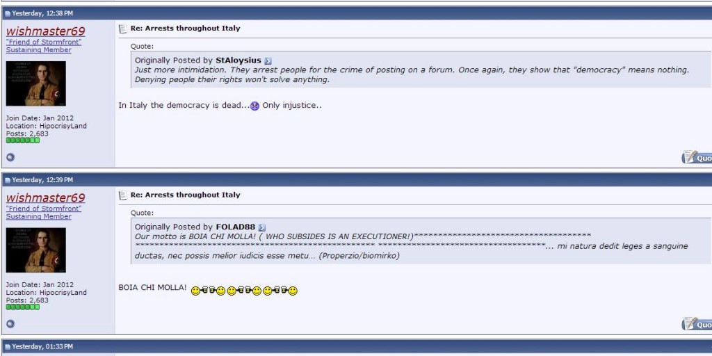 «L’ebreo Saviano vuole candidare un nero come sindaco di Castelvolturno». «Il solito giudeo coccolanegri che vuole distruggere la razza europea riempiendoci di sensi di colpa quando poi difende il sionismo, la peggiore piaga criminale attuale dell’umanità». «Noi siamo quello che facciamo, gli ebrei sono la nostra sfortuna». E ancora, nel 2012, contro il sindaco di Lampedusa Giusi Nicolini «sembra un’ebrea, assomiglia alla Nirenstein (una giornalista, ndr), due orribili befane partorite da una covata malefica ebraica». Infine attacchi a Carla Di Veroli quando era assessore alle politiche culturali dell’XI municipio e a due cronisti di Repubblica che hanno raccontato dei loro attacchi. Messaggi lanciati nel web firmati con ridicoli nickname: Complotto Giudaico, Re Arduino, Legionario88, Lupoereo, Adolf Galland, MrOlodolo. Questi e tanti altri i nomignoli utilizzati dagli eredi di Stormfront, coloro che, dopo l’arresto di 4 nazifascisti e l’oscuramento del sito neonazista, hanno continuato la propaganda attraverso YouTube e altri canali telematici. Nel mirino della Digos romana, che ieri all’alba ha eseguito 35 perquisizioni nei confronti di altrettante persone in tutta Italia (da Roma a Milano), sono finiti i nuovi componenti di un forum nazista. Uno di loro, Sergio Bettoni, alias Adolf, trovato in possesso, nel suo appartamento a Mantova, di munizioni da guerra, due fucili (due moschettoni, uno dei quali funzionante), un involucro di bomba a mano, 7 baionette, una bandiera con svastica e un metaldetector, è stato arrestato. Gli altri 34 sono accusati di diffusione sulla rete di idee fondate sull’odio razziale ed etnico e di incitamento a commettere atti di discriminazione e di violenza per motivi razziali ed etnici. Su sollecitazione del pubblico ministero Luca Tescaroli gli investigatori della Digos hanno così identificato gli autori di messaggi e di un filmato postato su internet chiamato «Il nemico occulto. Un documentario sulla questione ebraica», realizzato da utenti della sezione italiana del forum Stormfront, che riproduceva immagini finalizzate ad accusare gli ebrei della crisi economica mondiale, indicando alcuni di loro come titolari di ruoli apicali all’interno di banche e altre istituzioni. L’attività di indagine segue l’operazione Stormfront culminata nel novembre 2012 con l’arresto di Daniele Scarpino, Diego Masi, Mirko Viol e Luca Ciampaglia accusati, si legge nell’ordinanza, di «diffusione di idee online e tramite volantinaggio, fondate sulla superiorità della razza bianca, sull’odio razziale ed etnico, e di incitamento a commettere atti di discriminazione e di violenza per moti-vi razziali». La sentenza di condanna fu epocale: per la prima volta un magistrato ha riconosciuto un’associazione a delinquere “virtuale”, ovvero consolidatasi sul web. «Il tentativo di far rinascere in Italia il gruppo nazistafascista Stormfront—ha dichiarato il presidente dell’Anpi, associazione partigiani italiana, Vito Francesco Pol caro —è assai inquietante e pericoloso. La nuova operazione in corso in tutto il Paese da parte delle forze dell’ordine per contrastare questo disegno è quindi molto positiva e sta portando alla giusta direzione.