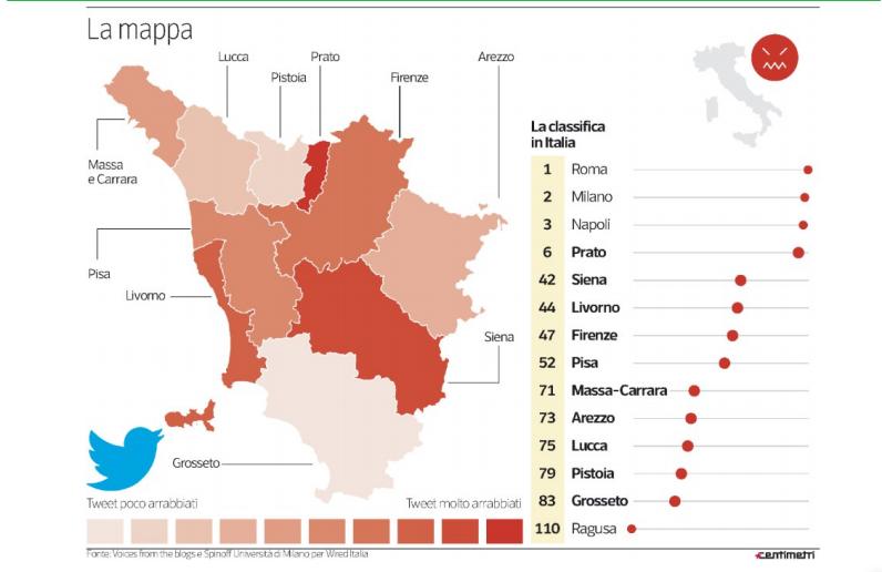 Prato La Toscana dell’odio sulla Rete, con Prato a dominare la classifica trascinata dall’elevatissima quota di «rabbia politica». Questo almeno è quello che emerge dallo studio elaborato dalla piattaforma «Voices Analytics» che ha preso in esame più di 8o milioni di tweet georeferenziati (di cui si poteva dunque riconoscere il territorio da cui erano stati inviati) nelle no province italiane. I cinguettii studiati sono quelli pubblicati nella seconda metà dell’ultimo anno, il 2016: nella classifica generale Prato è addirittura al sesto posto in Italia, preceduta solo da Roma, Milano, Napoli, Cagliari e Torino. Per trovare altre province toscane bisogna scendere fino alle posizioni 42 – occupata da Siena – e 47, occupata da Firenze. L’analisi di Voices Analytics — realizzata con «Voices from the blogs» assieme ad uno spinoff dell’Università di Milano e pubblicata su Wired — suddivide la rabbia in diverse categorie. Quella riferita ai tweet velenosi che riguardano la politica vede toccare picchi altissimi proprio nella città di Prato: è prima in Toscana e seconda in Italia, appena dietro la metropoli milanese. Nella stessa graduatoria è fanalino di coda — con buon merito — Pistoia, che si piazza al posto 77 confermando il trend che la vede tra le città meno odiose sulla Rete. I pratesi del Web aggravano la propria reputazione nella classifica della rabbia misogina: posto 33 in classifica nazionale e — manco a dirlo — primo in Toscana. Un risultato preoccupante, mitigato solo in parte dalla sorpresa di non individuare la stessa città nelle prime posizioni della graduatoria che misura l’odio verso gli stranieri. Là dove tutti avrebbero scommesso sulla caduta ovvia, sono stati invece pochissimi i tweet razzisti in città. Né la forte pressione migratoria, né la presenza della comunità cinese insediata fra le più dense d’Europa hanno prodotto, secondo la ricerca, un effetto a cascata. Secondo gli studiosi di «Voices Analytics» la relazione tra rabbia xenofoba online e la percentuale di cittadini extracomunitari residenti in ciascuna provincia appare sostanzialmente piatta: «Questo sta a confermare — spiegano — che devono essere in moto altri meccanismi, più politici, per generare una crescita di astio verso gli stranieri, meccanismi che agiscono indipendentemente dal numero di stranieri residenti in un dato contesto». In compenso ci pensa Firenze a portare la croce: ottava in Italia per tweet a contenuto xenofobo. Il capoluogo non fa meglio nella classifica sul-l’omofobia, dove ottiene ancora il triste primato regionale e l’undicesimo posto nella classifica generale.