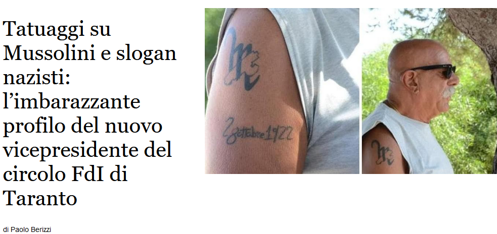 Poniamo una domanda ai vertici regionali e nazionali di Fratelli d’Italia: che ne pensano del profilo del vice presidente del loro circolo di Taranto? Approvano? Quei tatuaggi e quegli slogan sono in linea con lo spirito e con il “codice” del partito che guida il governo del Paese?