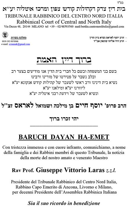 Per quello che riguarda il Tribunale Rabbinico da me presieduto, che serve le Comunità più in difficoltà e sofferenti, ossia quelle piccole e medie, ho ritenuto di affidarlo al mio allievo Rav David Sciunnach shlita, con l’intesa convergente di altri rabbini, sia italiani (in particolare Rav Elia Richetti, Rav Roberto Della Rocca, Rav Adolfo Locci e Rav Alberto Sermoneta) sia israeliani (Rav Eliahu Abargel e Rav Zalman Nechemia Goldberg). Voglia il Santo e Benedetto accompagnare questo difficile e delicatissimo lavoro, vegliando sulle nostre Comunità. In particolare, prego le persone la cui ebraicità è stata dichiarata da questo Tribunale ad aver coscienza del dono loro fatto, con tutte le responsabilità e gli oneri che ne conseguono, invitandole a rafforzare la loro vita ebraica in seno alle comunità di appartenenza.