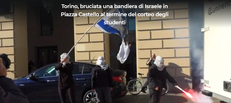 Con la bandiera di Israele data alle fiamme in piazza Castello al grido di ‘Free Palestine’ si è conclusa la manifestazione degli studenti scesi in piazza questa mattina a Torino per protestare contro la riforma della scuola del governo e a sostegno del popolo palestinese. Il corteo, nell’ambito della mobilitazione promossa in tutta Italia dal Fronte della Gioventù Comunista, e a cui è aggiunto uno spezzone arrivato da Palazzo Nuovo occupato, è partito in mattinata da piazza XVIII Dicembre e percorso le vie della città.