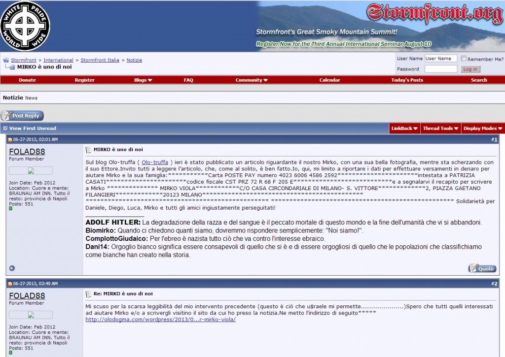 Insieme a Viola, lo scorso 8 aprile, vennero condannati con rito abbreviato, a tre anni Daniele Scarpino, 24 anni, ideologo del gruppo; a 2 anni e sei mesi Diego Masi, 30 anni, di Ceccano (Frosinone); e Luca Ciampaglia, 23 anni di Atri (Teramo), entrambi moderatori del forum. Per Scarpino era stata disposta anche l’interdizione dai pubblici uffici.