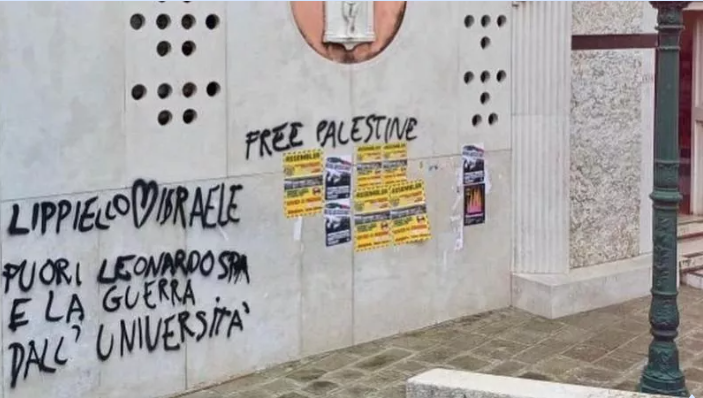 Delle scritte pro Palestina e contro la rettrice dell’Università Ca’ Foscari di Venezia, Tiziana Lippiello, hanno imbrattato il marmo di Carlo Scarpa, che riveste parte della facciata di San Sebastiano, sede dell’ateneo. Con «Free Palestine», «Fuori Leonardo spa dall’università» e l’accostamento della rettrice a Israele, il marmo è stato sporcato in maniera quasi indelebile: servirà un restauro per rimuovere le rivendicazioni.