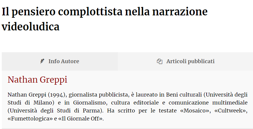 [3] Nicholas Gineprini, Me(n)talgear. Come un videogioco ha predetto l’attualità, a cura di Marco Vagnozzi e Alessandro Lolli, Divergenze, Belgioioso 2021, pp. 27-32.