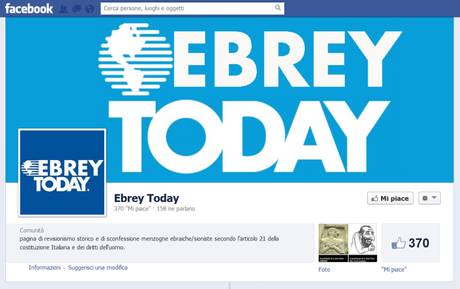 Pubblicata il 11 Settembre 2013 alle 460 × 289 in La pagina Facebook dal titolo ‘Ebrey Today’, di nuovo online dal 23 agosto, dove ci sono contenuti che inneggiano all’antisemitismo e negano l’esistenza storica dell’Olocausto, sulla quale indaga la Digos di Roma, 5 settembre 2013. ANSA / FACEBOOK